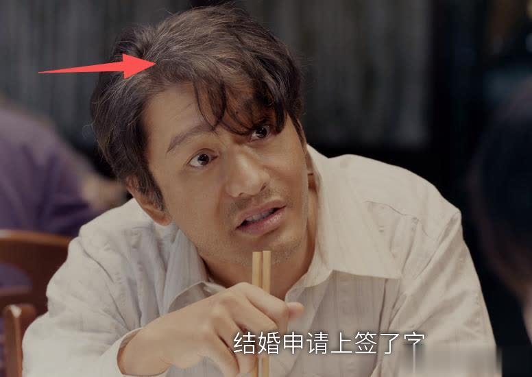 中年了的郑德诚,黄晓明的头上布满了白头发,而且还稀疏了不少,挺真实。