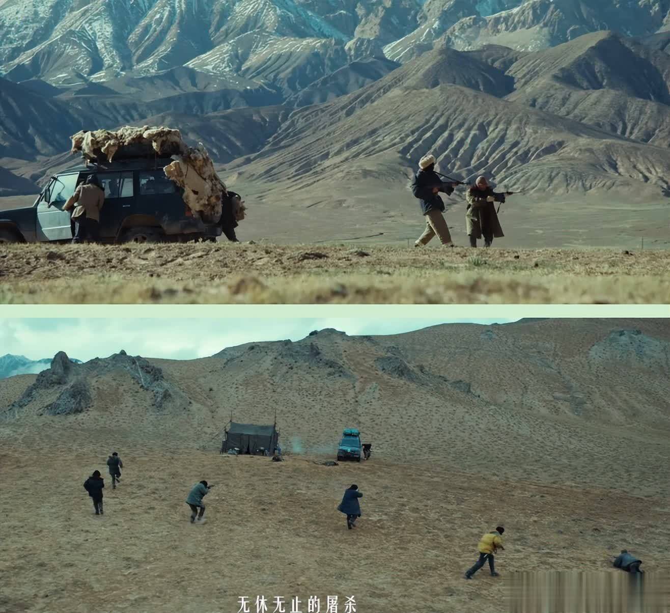 在车灯的辅助下,满地被杀掉的藏羚羊、胸前喷血的伙伴,看似遮盖了血腥和恐怖,但又说了很多。