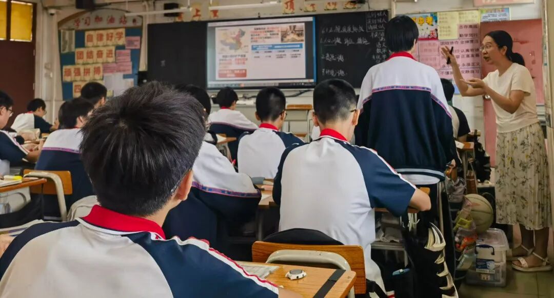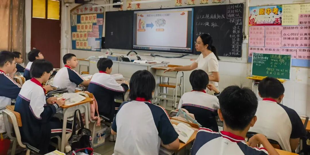 余老师以2024年我国人口、资源、环境的情况,带领学生层层深入、通过材料探究让学生具体地了解了我国人口、资源、环境的国情、重要性和相应的对策。在课堂教学中,关老师不但特别注重与学生的互动,调动学生的学习积极性,学生参与的积极性高涨,课堂学习氛围浓厚,而且也注重学生的自主探究,并适当的时候对学生进行环保意识的引导。